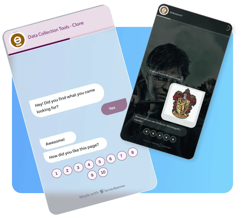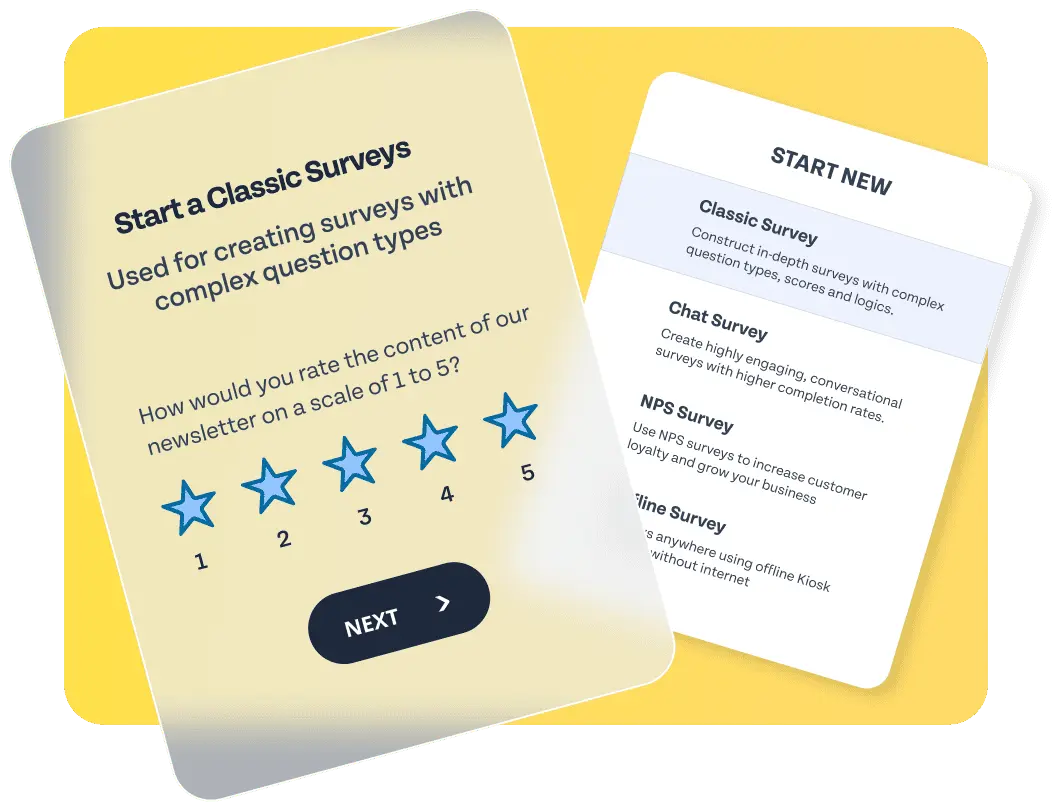 Create surveys swiftly using the intuitive interface of enterprise survey software. You can opt for chat-like surveys or conversational forms