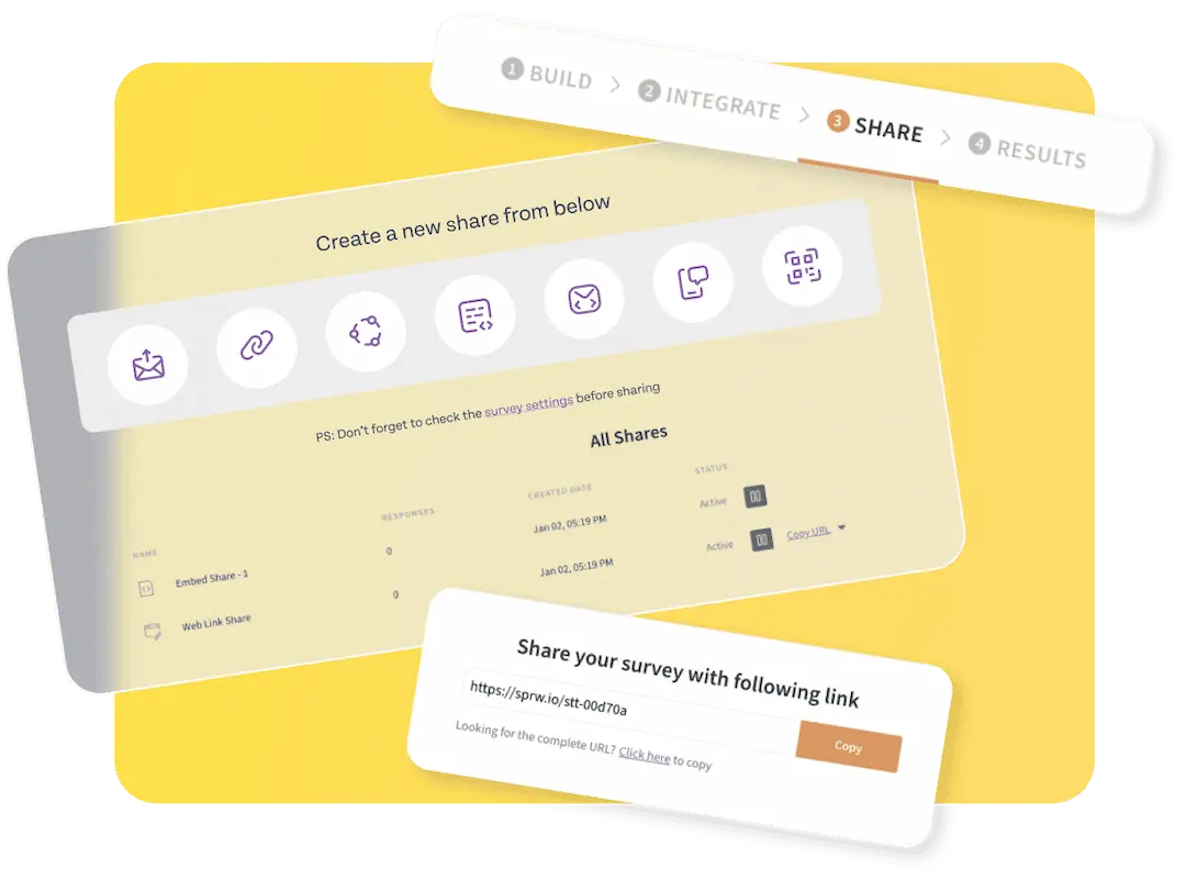 Ensure your surveys reach all possible channels through a weblink, emails, or SMS. Share surveys through a scannable QR code to respondents.