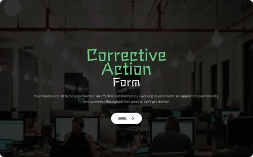 With SurveySparrow, this corrective action form template offers many benefits. Features like conversational UI, QR code sharing, ticket management, picture upload, third-party integrations, and others make it more than just an information collection tool. The form helps you solve process issues and streamline operations.