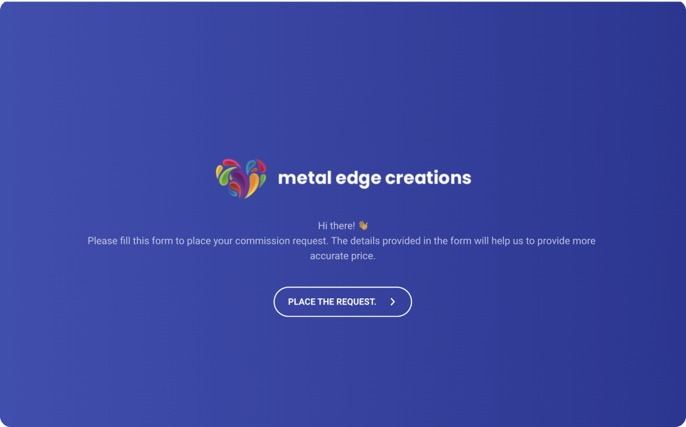 You would start by customizing this art commission request form template with the builder. This form would typically gather client information, their art preferences, desired size, medium, color scheme, inspiration sources, and any specific details they want in the art piece. You can add images of your past work to give clients ideas or as examples of different styles or techniques you offer.