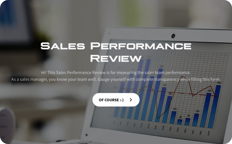 Sign up for free and start designing your sales performance review template. Choose relevant question types from the builder and frame questions to evaluate your employees. Make the form more beautiful by changing the background color, images, and font style.